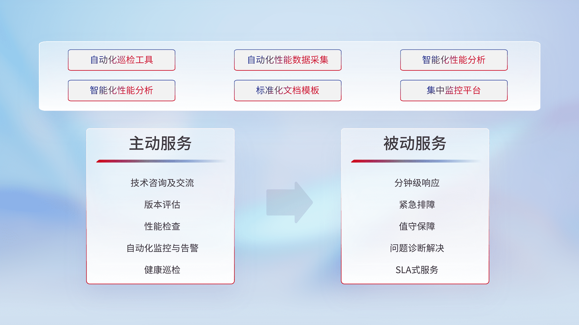智能化工具和标准化文档,,,保障服务质量,,,,提供主动服务(包含技术咨询、、、版本评估、、性能检查、、、、自动化监控与告警、、、健康巡检)和被动服务包含(分钟级响应、、、、紧急排障、、、值守保障、、问题诊断解决、、、、SLA服务)。。