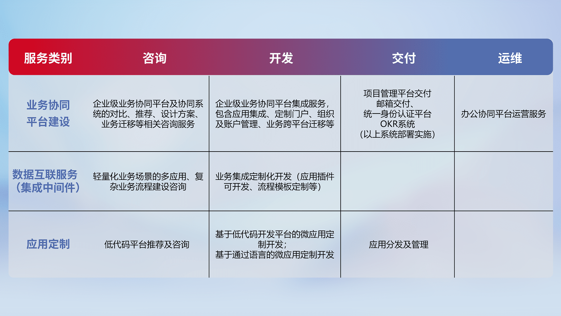针对钉钉、、、、企微、、IDaas等平台级产品提供产品的规划、、、、方案、、交付、、、定制化开发等服务,,实现如统一协同办公、、智能客户服务、、、混合会议管理、、智能数据查询、、、、等业务场景,,实现数字化转型。。